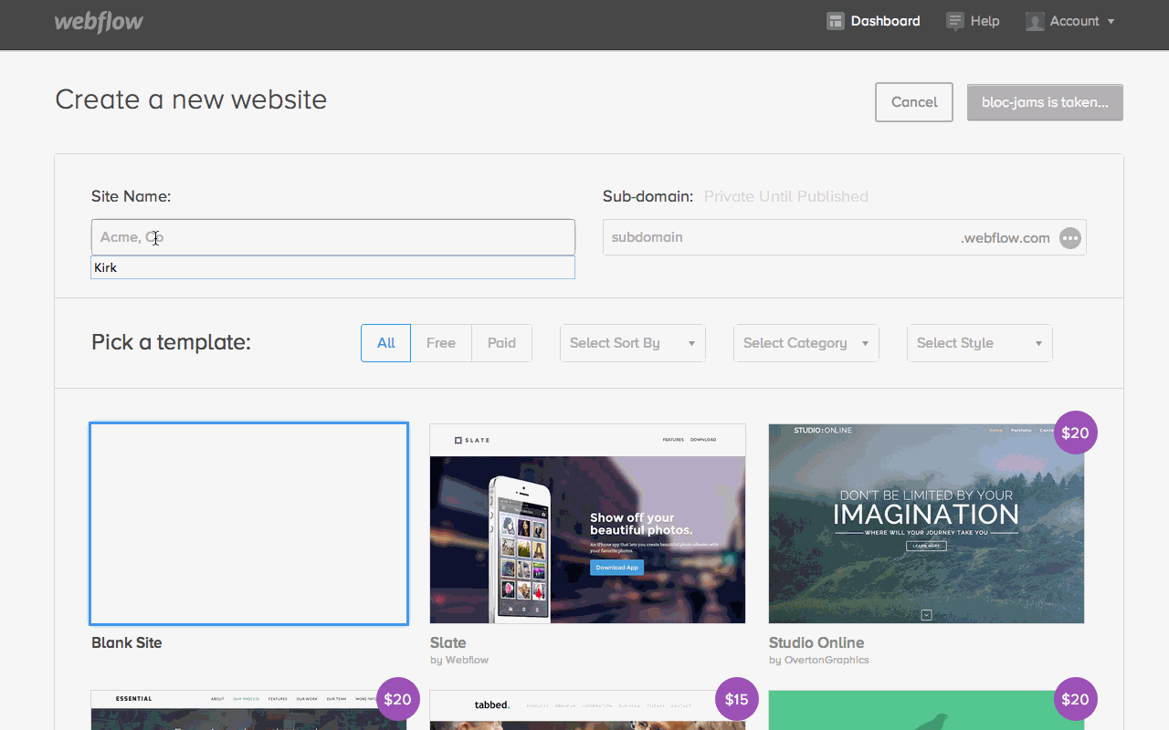 The first step is to name the site. Bloc Jams is already taken (our apologies), so you might want to add your name to the front of it, e.g. "Joey Jams". Select the Blank Site template, then click Create Website. You will be wisked off to the site builder application so we can begin our journey into Bloc Jams!